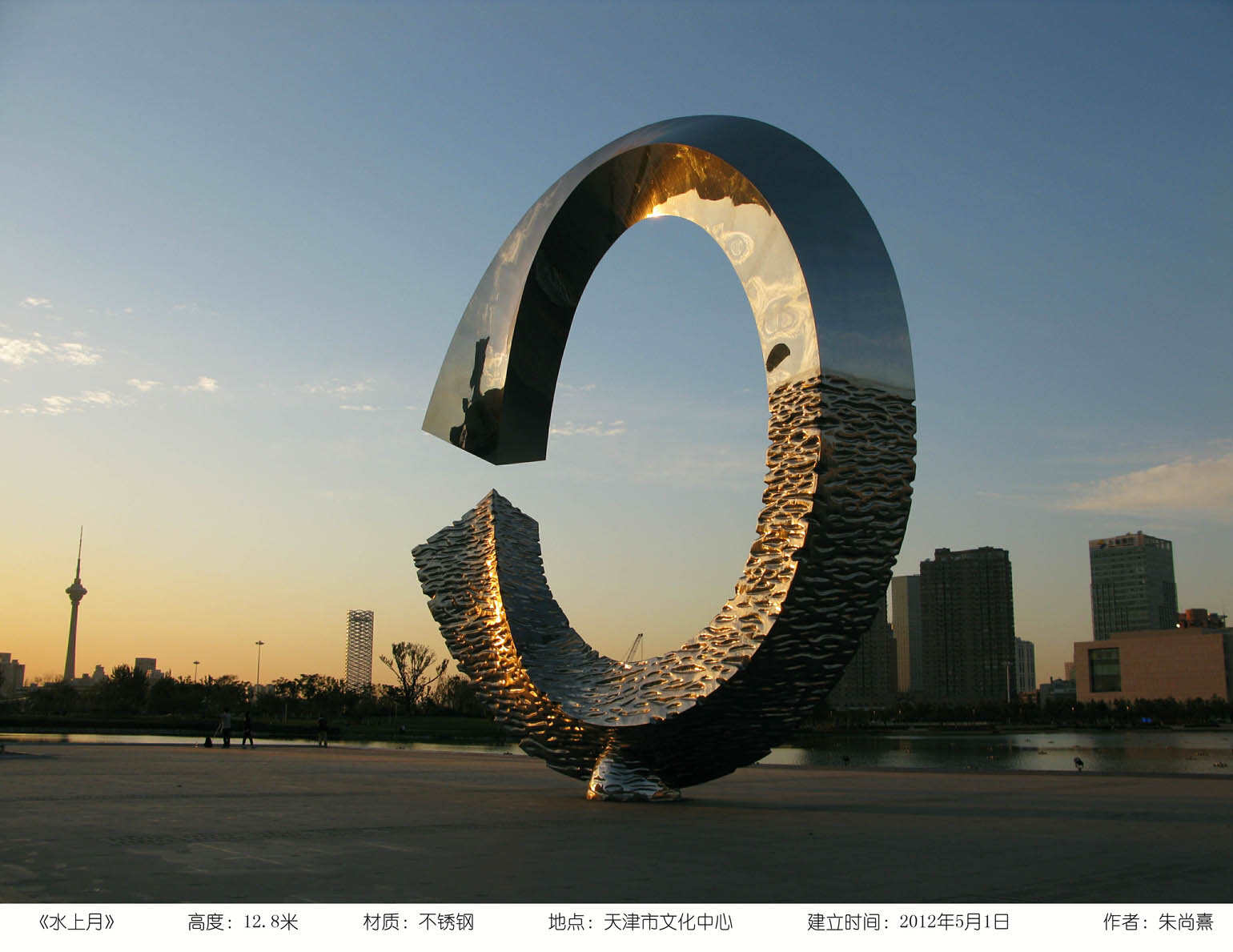 201251日,大型不锈钢雕塑《水上月》在天津文化中心的浅水平台上建立,正式面对公众,迎接国际劳动节。该雕塑高12.8米,雕塑的表面为镜面抛光。立起来的雕塑形态扭转有力,线条流畅,上下部分的肌理对比清楚,“月”的理念在水面上展示得晶莹剔透,流光溢彩。作为该雕塑的设计作者朱尚熹,无疑是非常高兴和荣幸的,所收到的各方面的反应都是正面的,肯定的。