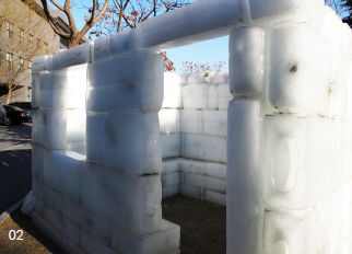 学生周守玺制作了很多冰砖,请来农民工盖房子,冰砖中混入的稻草最终随着冰砖的融化将浮于或嵌入地面,而那用冰砌的房子却渗入了地下,融入到泥土中,这是生命的规律,也是周守玺发自内心的对农民甚或自己命运的同情。此时的冰水就是血液的象征,而那稻草却述说着存在的虚无性。这个带有行为和装置的作品似乎在告诫世人,梦想中的现实也是现实,它一点也不虚幻,失落的现实中的梦想只是变成了可视的悲凉与哀伤。而真正盖房的人却永远无法拥有梦幻般理想的居所。他的作品是一首梦想与现实交映生辉同生同灭的悲怆诗歌。