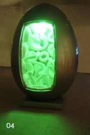 秦玮鸿用钢板焊接了一个蛋形空间,内壁为柔软的弹性棉体材料,顶上是一盘酷似蛋黄的灯具。它力图用铁板营造一个新的生存空间,一个外壳坚强而又冰冷的但内部却温暖如产房的家。大家知道,铁是农业社会做农具的最佳材料,而鸡蛋是乡村最为重要的农副产品,当城市化改变了农村的一切条件时,人变成能生蛋的鸡,或能思想的鸟,也是完全有可能的,这如同进化论一样,具有不可不信的科学逻辑性。从此作品中我们联想到他之前创作的另一件作品,那个具有柔软性感的内部,但却有着不锈钢外壳的生命通道。这两件作品具有同一种言说方式即对抗而又融合、顽强却又腼腆、生硬但不奸猾,这正是秦伟鸿本人的特色之处。