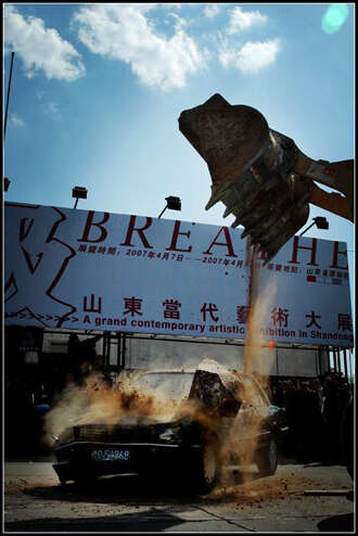 而这次在《山东当代艺术大展》开幕式上现场砸汽车,则是付诸行动了——